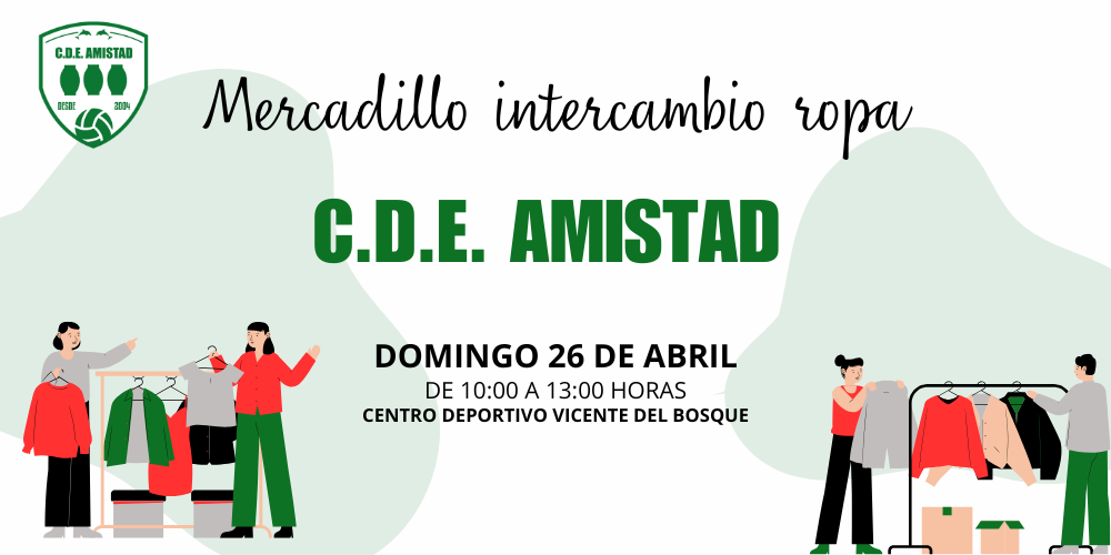 Con la llegada del buen tiempo volvemos a organizar el Mercadillo de Intercambio de Ropa del C.D.E. Amistad que tendrá lugar en Domingo 26 de abril de 10:00 a 13:00 horas y será el último mercadillo donde poder intercambiar ropa de la marca Gañafote.